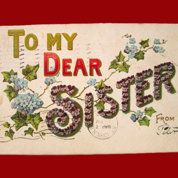 Antique (stamped March 6, 1908) "To My Dear Sister from (handwritten Jeté on bottom corner) with your greenery & light blue flowers. The back of the postcard is just a signature from (famous) Brooklyn, NY (to let his sister obviously know she is not forgotten & maybe have some souvenirs to bring her??) This is usually what family is secretly hoping when a member goes off where there are interesting things they could, or might bring on their return!?