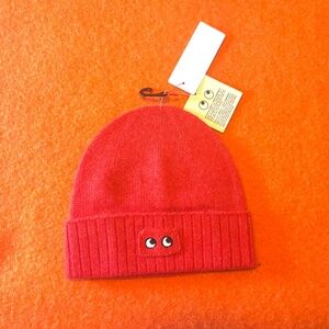 Anya Hindmarch Uniqlo collab red 100% cashmere knitted beanie hat tuque new with tags. Luxurious 100% cashmere that’s warm, lightweight, and smooth to the touch, patch with the iconic Anya Hyndmarch embroidered round eyes, sewn only at the corners for a hand-crafted look. Colour is accurate in the stock photos, mine are taken in artificial light. Marked One size, please see pics for measurements. This item comes from a smoke free, pets friendly home. Recycled bags/box used when possible. Please, let me know if you'd like any additional pictures and/or measurements or other info. Thanks for watching!