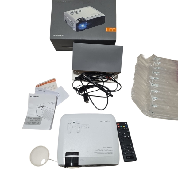 Immerse yourself in cinematic experiences at home with this Apeman LC350 Digital Projector. This updated LCD technology device delivers crisp visuals, perfect for movie nights or presentations. It comes complete with its original box, remote control, power cables, and user manual, ensuring you have everything you need for immediate setup. In excellent thrifted condition, it's ready to bring large-screen entertainment to your space.