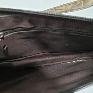 Apostrophe Faux Leather Brown Patent Embossed Croc Pattern Handbag.