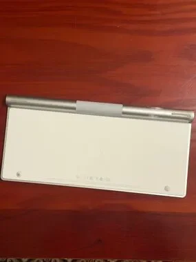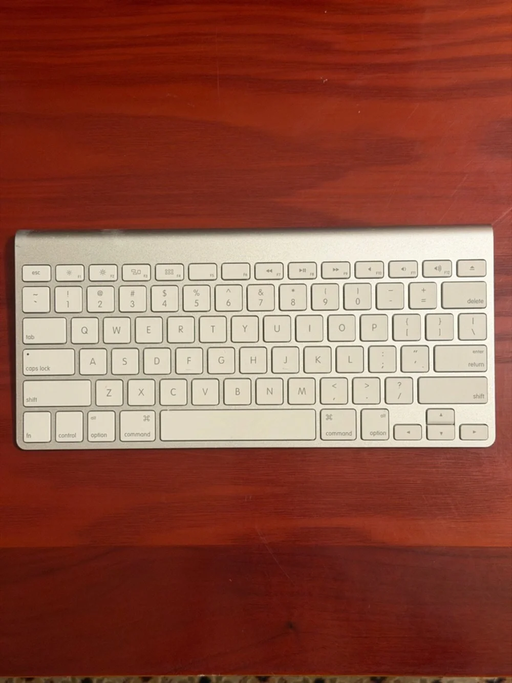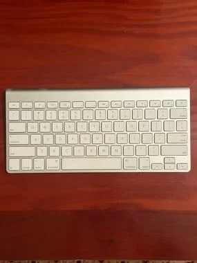 Slim wireless aluminum Bluetooth keyboard in silver. Compact layout with low-profile keys for comfortable typing. Designed for easy pairing and reliable wireless performance. Some wear shown in photo, works flawlessly.