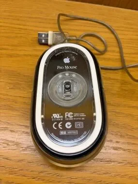 Classic Apple wired mouse with a clear shell. Black glossy top with white Apple logo. USB connection for plug-and-play use.