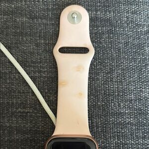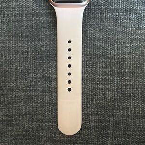 Discover the elegance of the Apple Smartwatch, featuring a sophisticated silver casing and a chic cream band. This wearable boasts a square-shaped display with rounded corners, perfect for seamless connectivity and fitness tracking. Its minimalist design ensures a comfortable and stylish fit for any occasion. I bought it a few years ago go and barely used it, The band does have a little bit of staining on it but those are easily replaceable on Amazon cheap otherwise in great condition. Does come with a charger!
