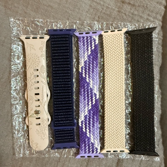 Five interchangeable watch bands. Includes braided purple/white, navy woven Velcro, cream woven, black woven, and a floral-printed ivory silicone band. Fits standard smartwatch connectors. Mix of woven and silicone textures. Great for changing up your look.