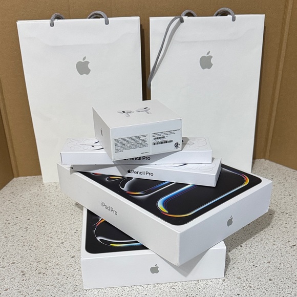 Apple empty boxes includes iPad Pro, Apple Pencil and AirPods. Elegant white packaging. 2pcs Apple paper bags