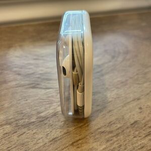 Sleek white wired earbuds in a compact case. Perfect for music on the go.