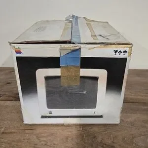 Apple Monitor IIc (Model A2M4090) complete with its original retail box. This 9-inch monochrome green phosphor display was the iconic companion to the Apple IIc computer line and features the classic "Snow White" design language and vibrant rainbow Apple branding. The monitor casing is in solid condition with some light, age-appropriate yellowing, while the tube remains clear and free of major defects. The included original box, though showing moderate shelf wear and vintage tape residue, remains a highly sought-after "survivor" piece that adds significant display and collector value to the hardware. Perfect for any retro-tech enthusiast or vintage Apple collector, this bundle represents a rare opportunity to own a boxed example of 1980s Silicon Valley design.