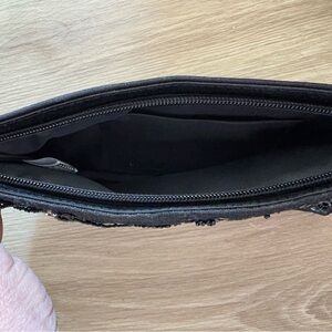 Elegant vintage-inspired black beaded evening bag by April Cornell. Features intricate black floral sequin and bead embellishments on lace overlay, satin back, and a multi-strand seed bead shoulder strap with crystal accents. Zipper closure and black interior lining.