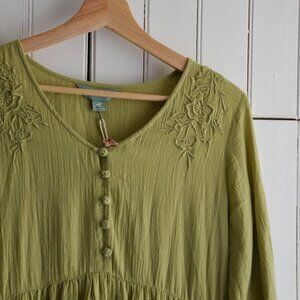 Elegant maxi dress by April Cornell. Features a soft olive green color. Embroidered details on the bodice. Long sleeves and flowing skirt. Super cute! Just too small for me.