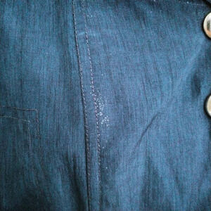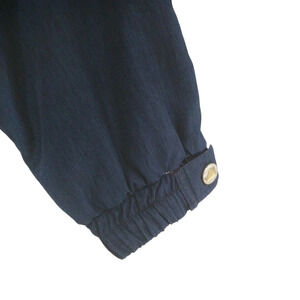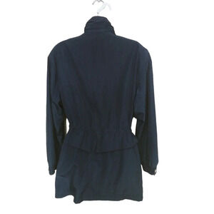 Retro style lightweight wind resistant coat. Dark navy blue in color. Lightly padded shoulders. Full front zipper close with zipper overlay. Cute buttons with triangle motif gold colored metal accents. Drawstring waist. Large front deep pockets. Elastic cuffs.