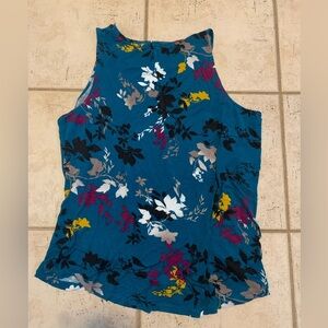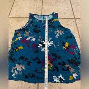 "This is a vibrant floral tank top from Apt. 9 Essentials. It's a size XXL and features a beautiful all-over pattern with teal as the main color, and accents of burgundy, yellow, white, and black. The fabric is soft and comfortable, perfect for a casual summer day or layered under a cardigan. The back has a subtle keyhole detail at the top. The tag is a bit faded, but the size is clearly marked XXL. Please see the photos for a close-up of the pattern and tag