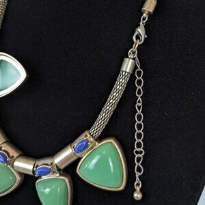 This necklace by Apt. 9 is made of a silver tone metal and has an adjustable lobster clasp closure. The necklace has a round metal mesh chain that has free-moving pieces at the front. The front pieces alternate between cylindrical beads with blue plastic ovals and larger green plastic triangles with open backs, and plain cylindrical "spacer" type beads. The necklace has normal wear, most visible as tone darkening in the metal, but is still very wearable and a lot of fun.