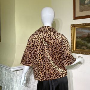 In excellent preowned condition gorgeous 50’s glamour teddy jacket in soft and fuzzy leopard print fabric. Inspired by Hollywood legends like Marilyn Monroe and Jane Mansfield, this lovely jacket has a retro vibe that can be mixed and matched and worn with jeans for a fun look or a little black dress for instant glamour.