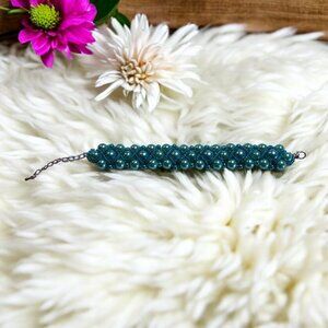 Aqua Blue Faux Glass Pearl Bracelet. Handcrafted with a striking blend of 8mm, 6mm, and 4mm round smooth aqua faux pearls, this 7" bracelet features a 2" extender chain for a custom fit. Delicately woven with aqua seed beads and adorned with silver-plated hardware, it exudes elegance and charm. Versatile and sophisticated, this bracelet effortlessly enhances any outfit, adding a splash of refinement to your look. Approximately 1" wide.