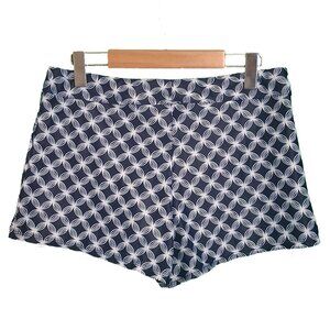 Aqua Eve tankini with blue tank top and blue and white geometric patterned shorts .