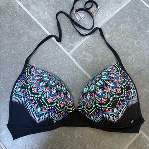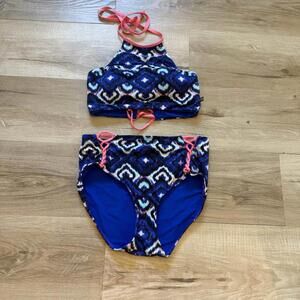 Beautiful floral halter-style tankini top with ruffle detail and lace-up front.