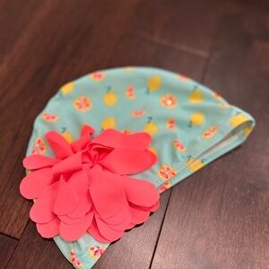 Adorable aqua swimsuit set dance costume with colorful fruit print and ruffle details. Perfect for a ballet, jazz or acro solo