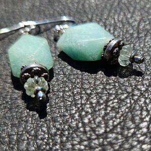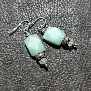 A pair of icy blue earrings, featuring a matched pair of faceted amazonites (measuring 1.25cm long), fluted aquamarine rondelles, and lovely sterling silver accents.