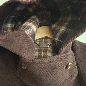 The fabric is a thick brown wool that feels rugged and sturdy. Features thick 2-way Vislon zippers. Storm flap with horn button closure. Plaid lining. Handwarmer pockets at chest as well as flap pockets at waist.