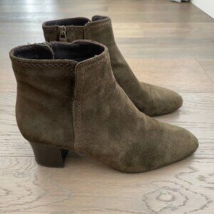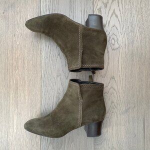 Aquatalia Made In Italy Block Heel Almond Toe Suede Leather Booties w Side Zip & Cross Stitch Detail in Olive Green