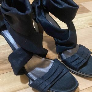 Step out in style with these striking black strappy heels. Perfect for any occasion can be dressed up or down with a cute pair of distressed ankle jeans. In great preloved condition. Leather foot bed and foot strap lined with leather. Gorgeous materials and zipper closure on the back heel. Soles and heel show little wear. Just over 3inch heel.
