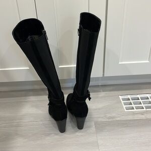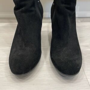 Aquatalia tall heeled waterproof black suede boots. Side zipper closure, rubber gripped outsole/heels, elasticized stretch panel on the back. Size 8.5. Good pre owned condition with some wear to the outsoles, some wear/ scuffs suede material. Please see photos, Reasonable offers welcome!
