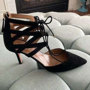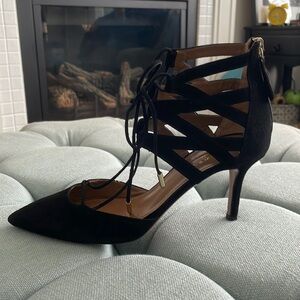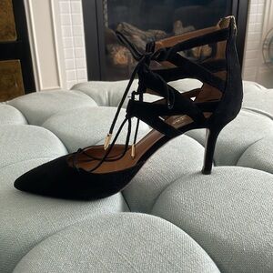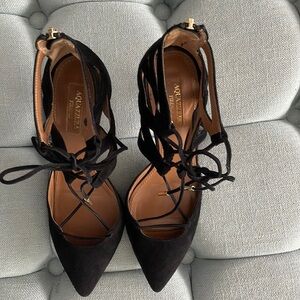 Aquazurra iconic belgravia 75 back suede pumps with gold tone hardwares criss-cross laces, pointed toe and backside ankle zip closure. Made in Italy. Size EU 37 1/2. Very good used condition with some light wear to suede, wear the outsole (could definitely use some protectors to extend the life of these beautiful shoes) most of the wear is on the back of heels and heel tip. No original box or dust bag. Please see photos, reasonable offers welcome!