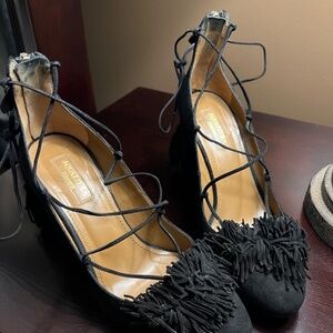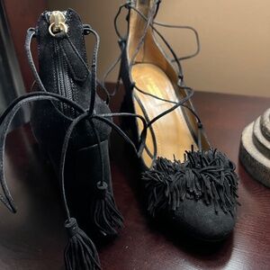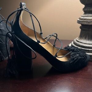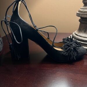 Round Toe with fringe Accents Wrap around straps Box and dust bag included 3.25 inch heel Worn 4-5 times