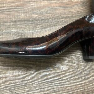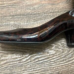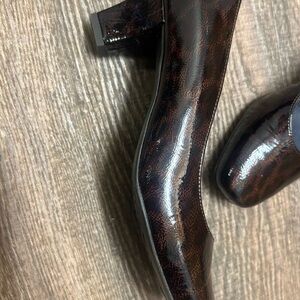 Ara NWOT 9.5 brown patent leather heels, subtle print underneath designed with a sleek square toe and a comfortable block heel. These slip-on shoes offer a polished look, perfect for both professional and formal settings.