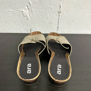 Stylish tan leather sandals by Ara. Features wooden sole and open toe design. Perfect for casual wear. Fits larger than Size 7 (more like an 8).