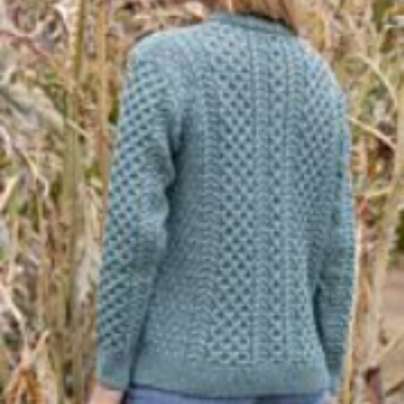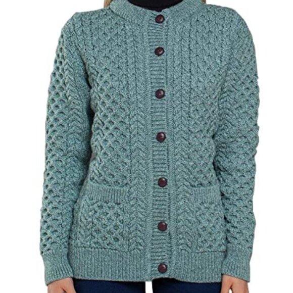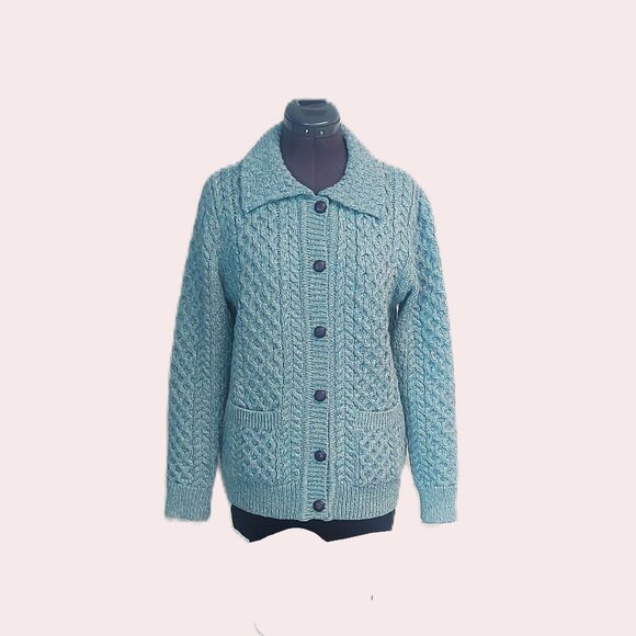 This luxurious cardigan oozes style and sophistication, you can see the stunning Irish Aran cable knit stitiches on the front, back and sleeves of this sweater. It features a full button front closure, two front pockets and a tighter knit at the cuffs, the front placket, and lower hemline to keep you cozy. Although it is a wool, the best feature of merino wool is it's breathability, it keeps you warmer when needed but also cooler when it warms up AND it's not the least bit itchy! The measurements are: Length 24 inches (60.96 cm ), PTP 19 inches (48.26 cm), sleeve from shoulder seam to cuff end 22 inches (55.88 cm). I love this sweater, I wore it with my jeans, dress pants, skirts and dresses (even in the spring). I was lucky enough to receive another as a gift so I thought I'd pass this one on to a new home for someone else to enjoy.
