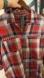 Stunning mixed media plaid shirt with button-up style. Features red, blue, and white patterns on front and flora details on the back.