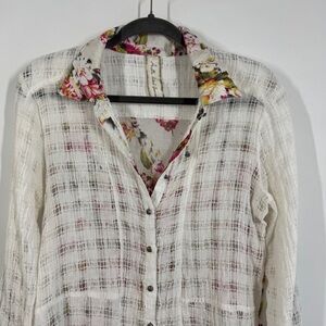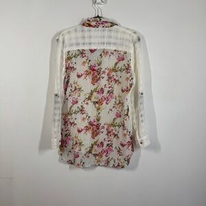 Aratta Silent Journey Button Down Sheer Plaid & Floral Blouse White Pink