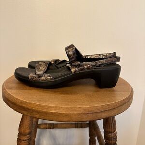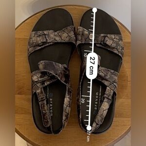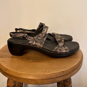 Aravon brand by New Balance comfort sandals. Women’s size 11. Brown/black/tan snake skin pattern on the straps of the sandals. Sandals have toe and ankle strap and comfort cushioned sole. In excellent condition.