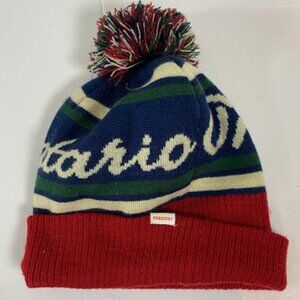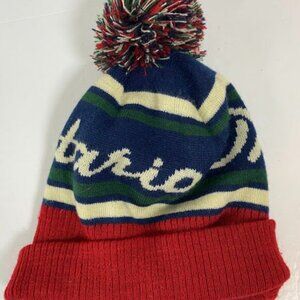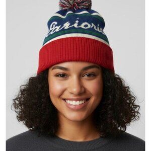 Relevant Keywords: Arborist Beanie, Pom Pom Hat, Knit Cap, Bobble Hat, Retro Beanie, Ski Hat, Fair Isle/Jacquard Knit, Navy Red Green Beanie, Script Logo Hat.