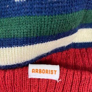 • Jacquard Knit Pattern (Features bold stripes and a large script word, likely "Arborist," on the body)