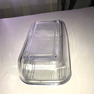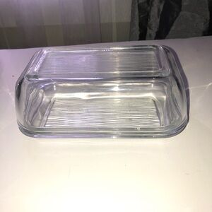 Vintage Arc France Elegant clear glass butter dish. Perfect for any kitchen setting. Durable and stylish with ribbed bottom, this butter dish holds a pound of butter. We keep one in the fridge and one in the cupboard as butter doesn’t last long here. Sometimes if we have leftovers , we will pop in here if we don’t have a container- excellent shape no chips or cracks.