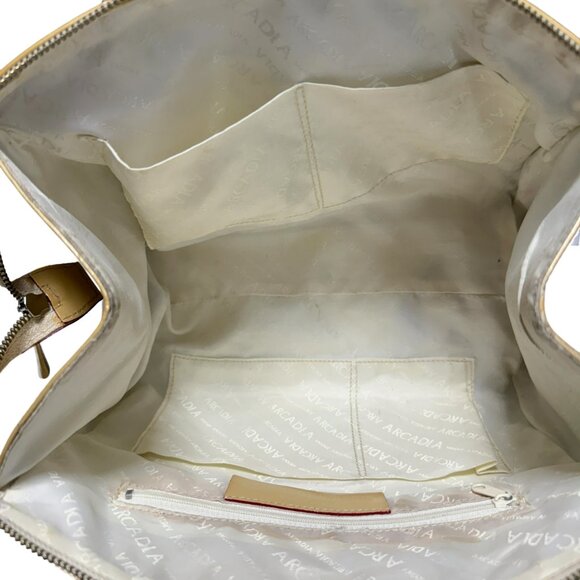This Arcadia beige leather satchel is a perfect fusion of Italian craftsmanship and everyday sophistication. Featuring the brand's iconic embossed monogram pattern, this structured medium-sized handbag brings a polished edge to both casual and formal outfits. The top handle silhouette offers timeless versatility, while the zip-top closure keeps your essentials secure. Crafted in glossy coated leather, the bag opens to a clean, Arcadia-logo-lined interior with side pockets and a zip compartment. A classic wardrobe staple with luxury details like chrome hardware and studded feet.