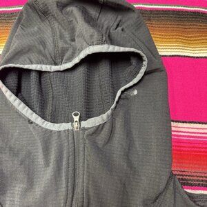 One of the front hand pockets has quite a bit of wear and there is a stain on the hood as pictured. See pictures for exact item and measurements.
