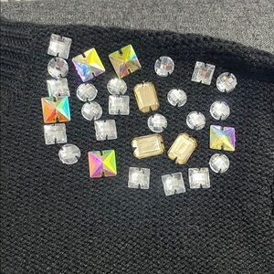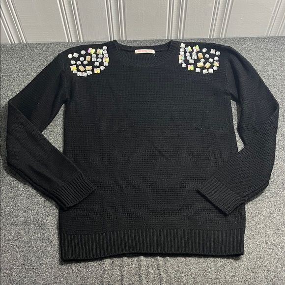 Chic black sweater featuring vibrant embellishments on the shoulders. Ideal for a stylish look.
