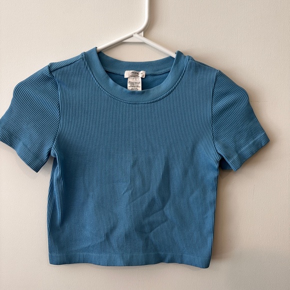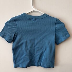 Trendy blue ribbed crop top. Perfect for casual wear. Soft and comfortable.