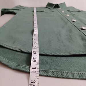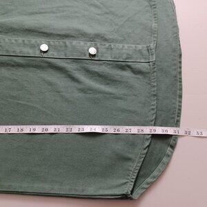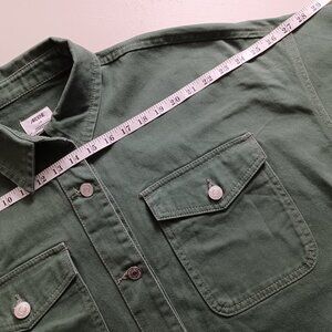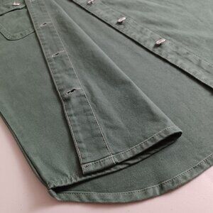 A casual button down jacket in a hunter green colour. The twill cotton material keeps you warm, yet it's still breathable. It has spacious front pockets and the cuffs can be easily unbuttoned for a more laid-back look and feel. It has a comfy, loose fit that makes a great layer when the weather starts to cool down. Perfect for early fall. New without tags. Excellent condition.