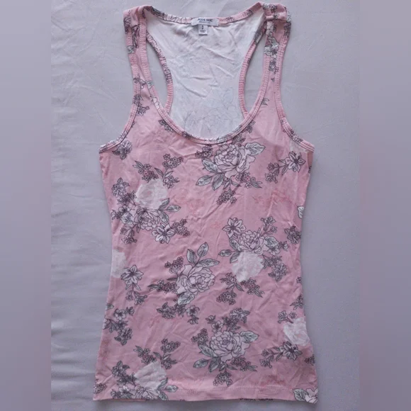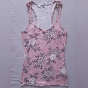 Soft light pink racerback tank with subtle floral trim. Lightweight knit for easy wear. Feminine and casual design. Perfect for everyday layering.