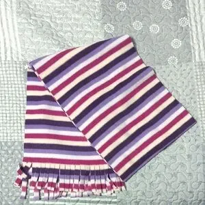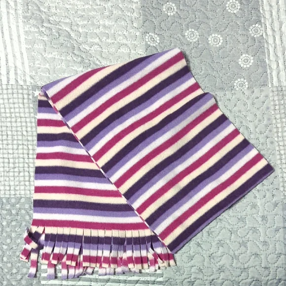 Vibrant scarf with stripes in purple, pink, and cream. Features fringe ends.