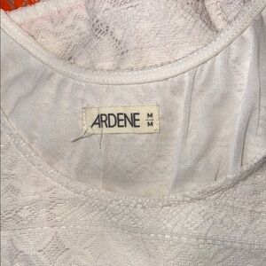 This casual sundress by Ardene features a sleeveless white scoop neck top paired with a flowing orange chevron maxi skirt. The vibrant pattern and comfortable fit make it perfect for warm weather outings. Has a half slip lining. The lacey top has a bit of stretch, the skirt has no stretch.