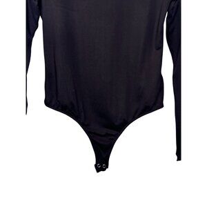 A black Ardene long-sleeve crewneck thong bodysuit. Features a crew neck, long sleeves, a thong cut, and snap buttons at the crotch. this bodysuit is considered a versatile wardrobe staple that can be dressed up or down.
