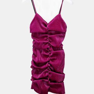 A shimmering fuchsia ruched mini dress from Area featuring a sweetheart neckline, spaghetti straps, vertical ruching along the seams, and a silver zip closure at the side.