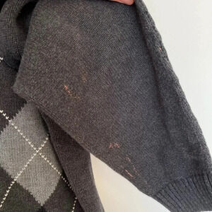 Size large, please take time to look at pictures, it was almost like new and I unfortunately dropped a little bit of bleach on it so it appears on sleeve.