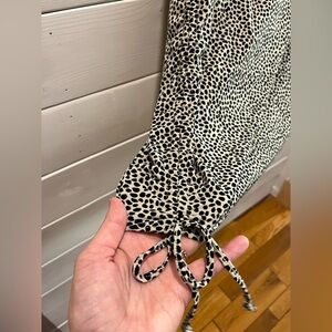 Step out in style with this comfortable and chic Ari & Clo midi skirt, size 22. Featuring a classic animal print with black spots on a cream or tan background, this skirt is perfect for adding a touch of flair to your everyday wardrobe. It boasts a comfortable elastic waistband with a decorative drawstring detail at the front for a perfect fit. The skirt has a relaxed silhouette and features elegant ruched detailing with a functional tie on one side of the hem, allowing you to customize its look. This versatile skirt is great for casual outings or can easily be dressed up for a more elevated ensemble.