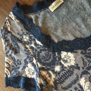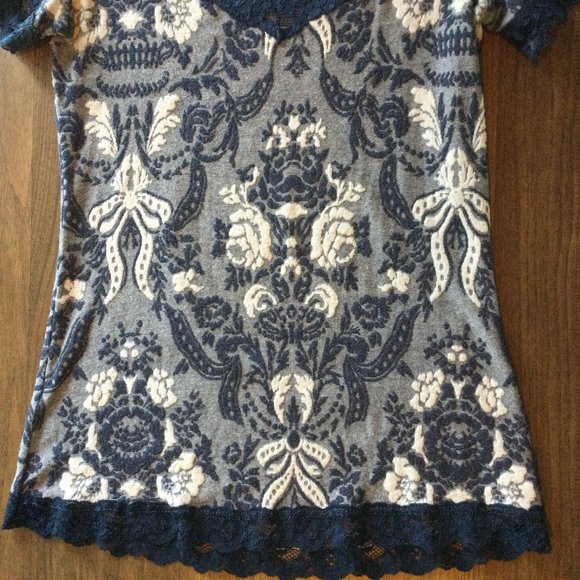 Elevate your everyday style with the Arianne Printed V-Neck T-Shirt, enhanced with delicate lace accents. This charming and comfortable t-shirt is designed to add a touch of elegance to your casual wardrobe. With its stylish print in white and blue, it's perfect for both relaxed and dressier occasions.